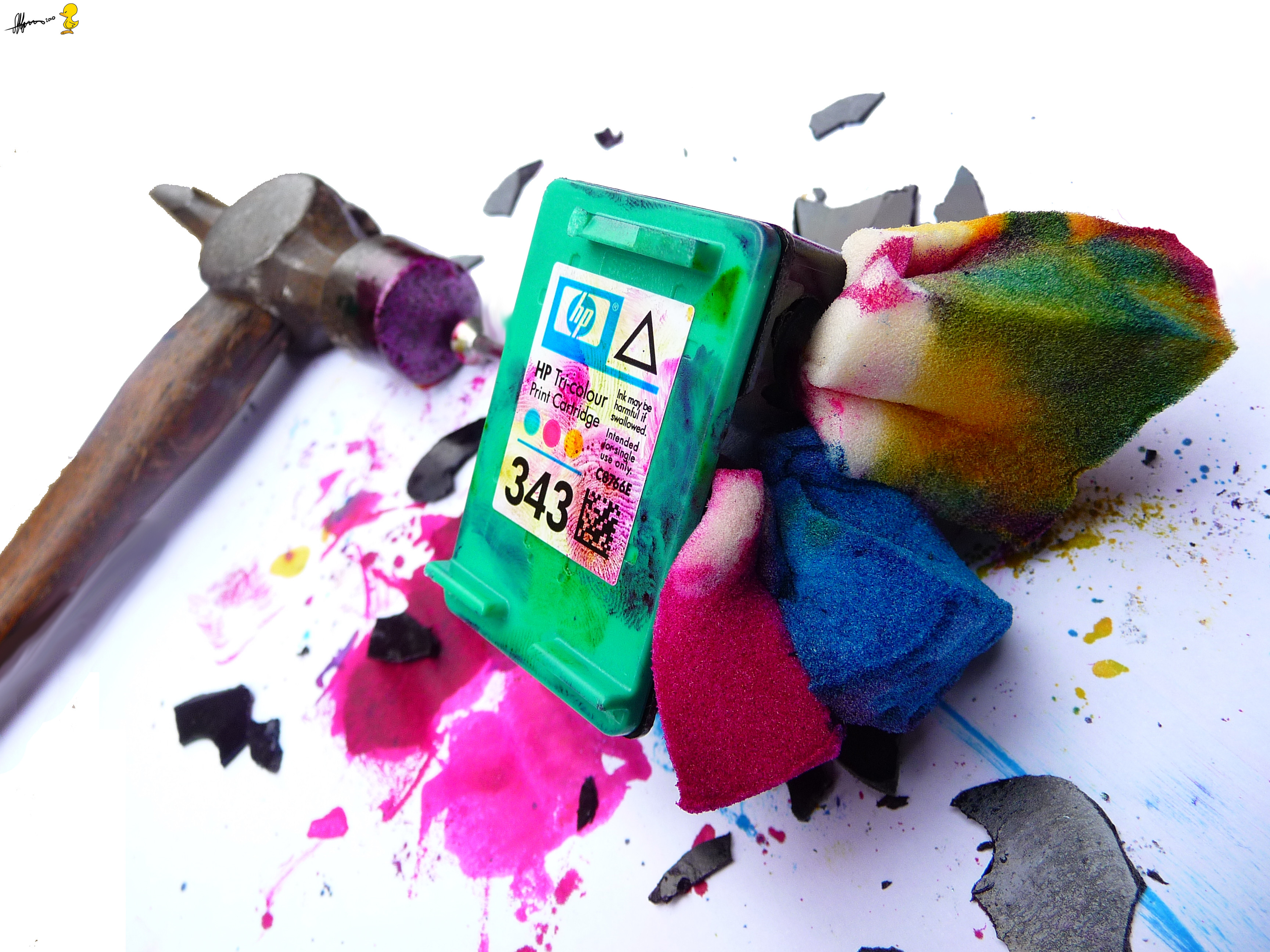 The colors of this piece are very pleasing to the eye although I do feel the piece doesn't visually state what you are verbally saying to me. I'm on point with what your goal is but then when I look for that in the image, its kind of lost in translation. Two main reasons. its hard to figure out what it is sticking out of the ink cartridge on the side and also its not clear that you used the hammer to break the ink cartridge - there is no sense of anger. My suggestion would be to actually have a person who is reeling back to make a swing at the cartridge and you can be taking the photo from the angle of the ink cartridge(placing the viewers perspective at a lower vantage point gives them a sense of weakness or inferiority) In the background could be uncompleted prints(making your failures into something positive - art)I don't mean to be harsh and I realize that this is a lot of work but if you are serious about it I do strongly suggest it