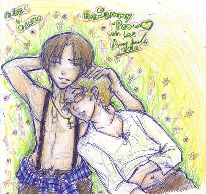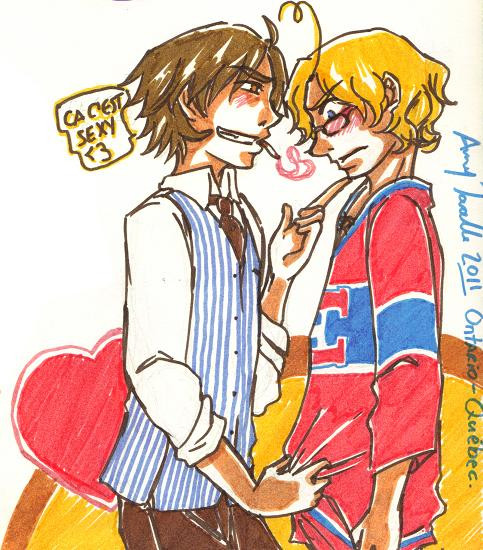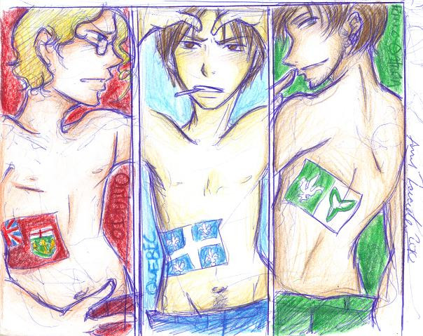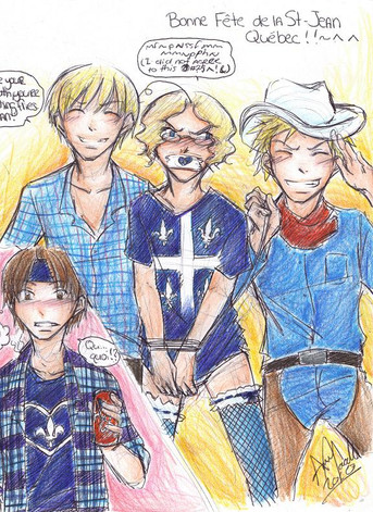Of course I'm saying that French towns in English provinces rock! Please don't take that tone seriously. Not my point that I was trying to get across and never really ended up doing so ^^" (I don't know if that's due to my english impairedness of because I'm stuck in midterms up to my neck). Is that it's only natural for you to prefer your region and me mine. I mean, I'm from Quebec and Ontario and Quebec and Canadian history is my area of research so it's only normal that I like drawing them most. I mean, I know Quebec's history on the tip of my fingers so I got a lot of context to draw him in and expend about. And when it comes to my art well...I guess I draw everybody equally, but a lot of it never ends up being put online cause I only post up the pieces that I like best. The other guys from the Matthewian actually get spamed with my other provinces stuff. Especially Alberta *cough cough* not that any of that is appropriated to put on DA XD I don't know, you got a really Quebec history student geek on your hands. But if you ever got anything to share about provinces that are not Quebec, Ontario, Manitoba or Newfoundland go for it, it might even inspire me.