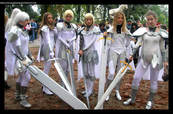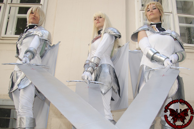 The costumes look pretty good. I wish you provided a bigger pic so I could look at each better but over all they appear to be pretty accurate to the manga... the capes appear to be hanging a bit low on some of the cosplayers and Irene's Claymore doesn't look as good as the rest (Lighting? an Effect of seeing the backside of it?)... The boots look too much like real boots painted metallic but it's had to find cheap armor anymore so it's forgivable