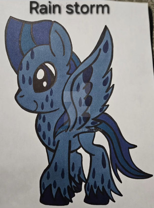 "Drizzle Drops always liked rainy days more than sunny ones. When it rains, she likes to put on her raincoat and splash in all the puddles. She gets a bit sad when the rain stops and the sun comes out, but if a rainbow appears, she hurries to Radiant Rainbow's house so they can admire it together, and Drizzle feels happy again."This is the first pony I drew in this style, though I didn't think to upload her picture until now. She's Radiant Rainbow's best friend. She's pretty shy, but luckily her dull gray coat helps her avoid unwanted attention. Rainbow is actually a bit jealous of Drizzle's plain looks, because she feels she can never live up to her extravagant appearance, and it's hard for her to go anywhere unnoticed.