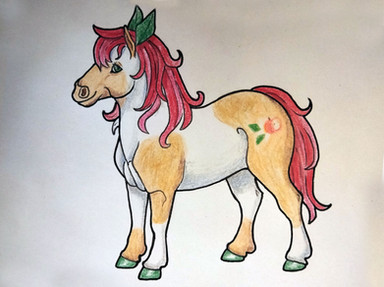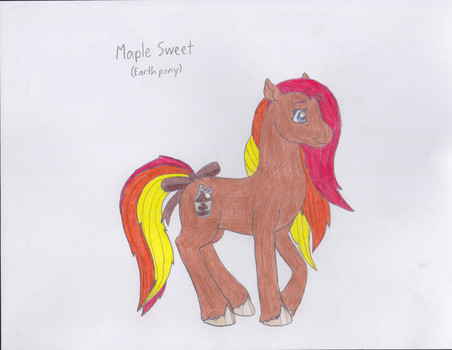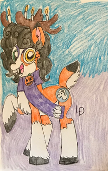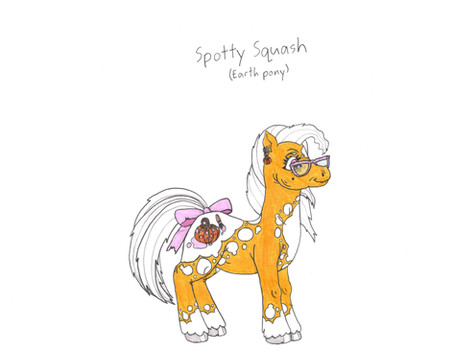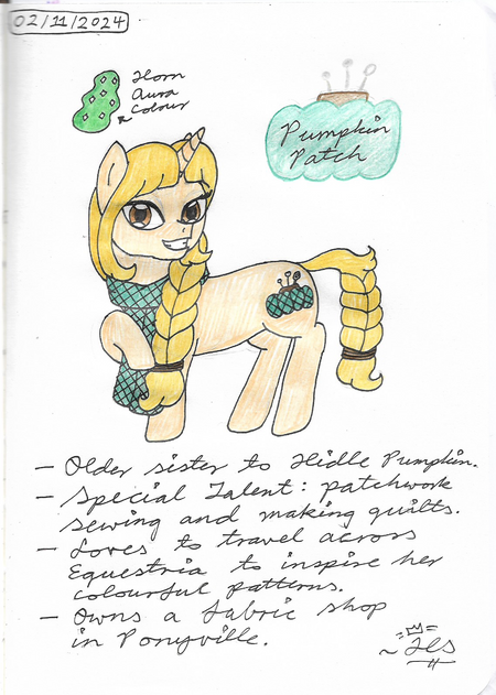 "Pumpkin Patch is the oldest son of the Pumpkin family, who have made their living growing pumpkins for generations. Patch was expected to continue the family business, but he didn't exactly have a green hoof. Every pumpkin seedling he planted ended up wilting and withering away before it could produce a single pumpkin. His parents were dismayed, and Patch felt bad for disappointing them. The only thing that brought Patch comfort was quilting with his grandma. On his Grandma's birthday, Patch gave his Grandma a beautiful quilt he had worked on in secret for months. She was so happy that she gave Patch a big hug, and in that moment, his cutie mark appeared. Now Patch makes a living selling his amazing quilts, and his sister has taken over farming."Funny story about his sitting pose: it was an accident. He was supposed to be standing, but I drew his head too low on the page, so I made a last-minute decision to draw him sitting down. I haven't drawn Pumpkin Patch's family yet, and I only have an idea for his sister's name. I should probably get started on that.