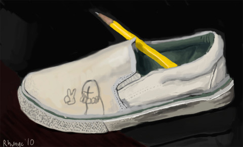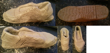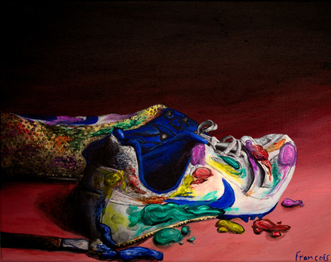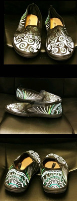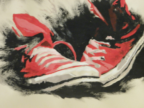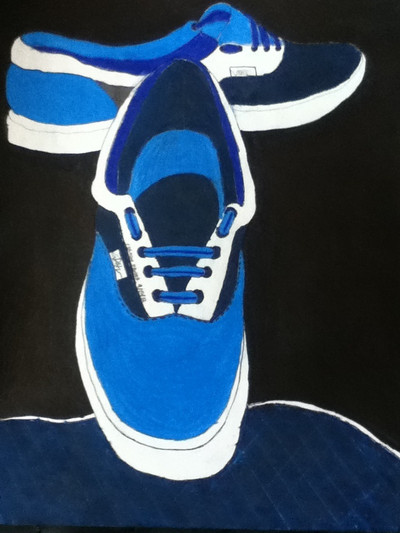Left: Acrylic Paint for background and stippling using markers on the shoes