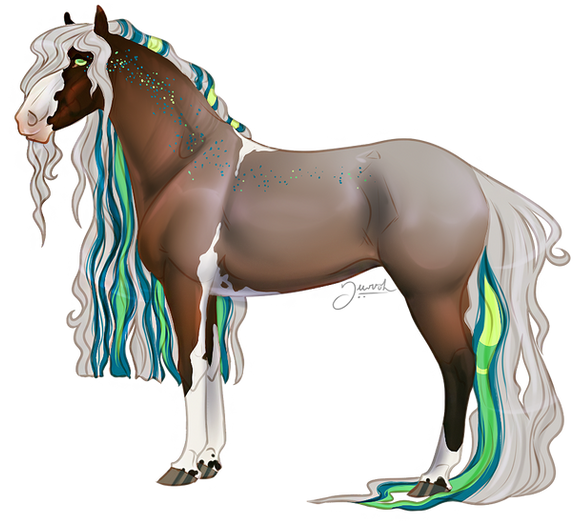 Personality: Oh my goofball. This boy is the funniest thing on four feet--or at least he thinks so! He is constantly prancing around the fields pestering the other horses with jokes and trying to instigate play time. He is at his happiest being chased around the pasture, and he doesn't mind the difference between GET BACK HERE SO I CAN KILL YOU DAMMIT and LET'S PLAY. He knows to stay away from Mystere, but sometimes he can't help himself. Everyone knows when he's pushed it too far because he sports a hoof-print somewhere on his body. It never dampens his spirits, though. He adores shiny things and has quite a collection hidden somewhere in the bordering forest. Somewhere. Sometimes he forgets where and then he's not so joyous to be around. Unfortunately for him, that's the perfect opportunity for everyone he bothers to bother him right back!