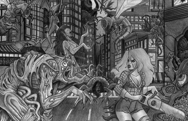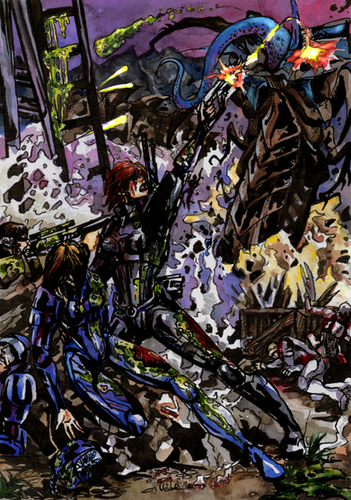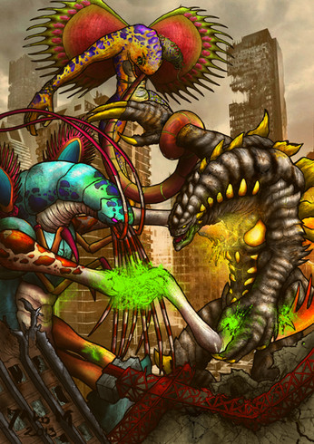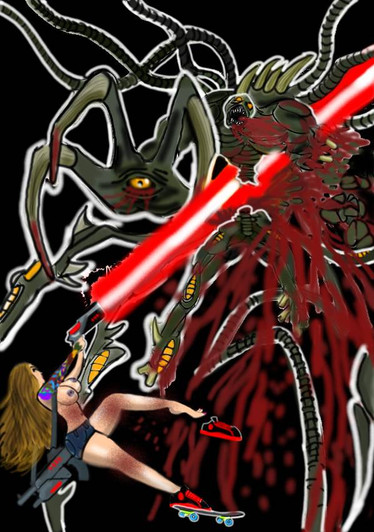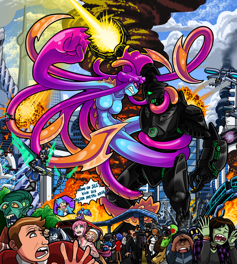 #action #alien #battleship #city #cityscape #colored #digital #fantasy #fight #girl #gun #hero #horn #jump #monster #sword #traditional