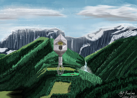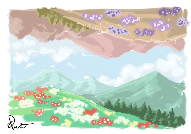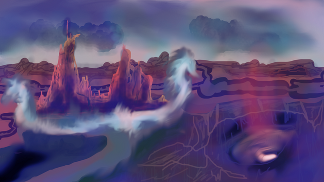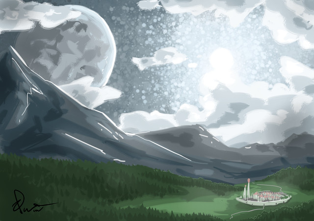 #architecture #building #clouds #digital #drawing #forest #hill #landscape #nature #waterfall