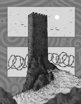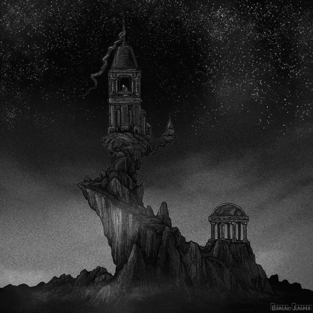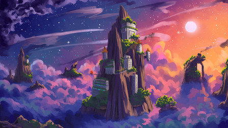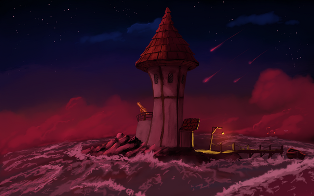 #building #castle #cliff #cloud #dark #digital #drawing #landscape #moon #mountain #purple #sea #stars #water #wave