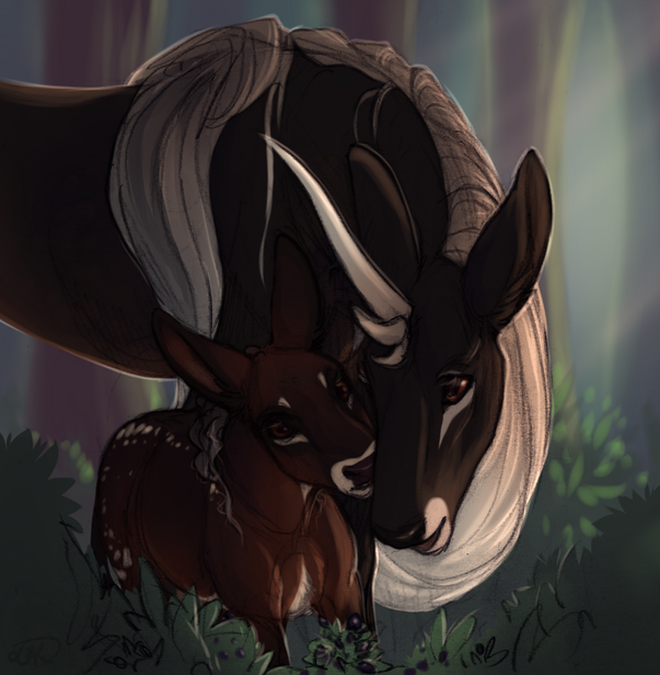 The pearled doe nosed the silly magpie off of the larger doe’s nose and redirected him, yet again, to stand only on Dei’s neck. After Hassle securely placed the flower, she gave the black and white corvid a small and tasty treat: a blackberry. When his work was over he would get the larger treat, a mouse that Enda had found and dispatched quickly with one sharp delicate hoof strike. She hid the mouse near by under some bark when the bird wasn’t looking. The magpie would do anything for a bit of meat, and Enda used that to her advantage.