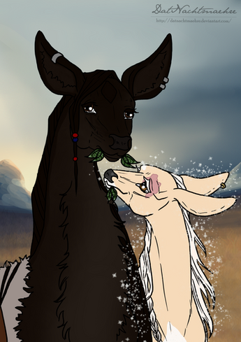 Enda normally was full of annoyance with the world at large. Today she was positively brimming over with it and she even had company to share in her endless irritation. The grand gala, a ridiculous show of doe-flesh for sale or barter, was to take place. Her companion, Dei, stomped a hoof and dug at the ground as a bright purple flower was worked into the braid. The Ram’s participation was more coercion, her pig-toed cousin orchestrated a bet in which the inky doe was now honoring. To walk the path lined by all in the herd, from commoner to Royal in a show of beauty and availability… or redemption. The Ram clearly was not available in any sense of the word with her belly round with foal. Her beauty was in her strength, which was not a cultural standard in Glenmore. So Enda worked with the third goal in mind- and set both herself and her pet upon the Ram with the intent to tame and charm the wildness innate in Dei into something the dark doe could be proud of.