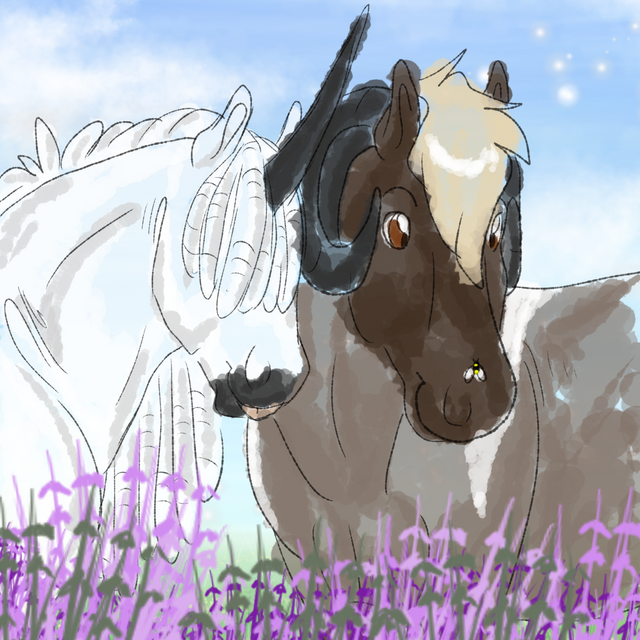 Enda laid her ears back and worked her magic into the ground at their feet, teasing roots out of seeds and giving the unusual choice of plant for plaits a burst of energy to bloom it. Bright purple blossomed in a fat fuzzy flower, a perfect contrast to the simplicity of Dei’s coat. The Ram did not need boughs of foliage to hang from her hide. The rest of the plant was green and thorny, typical of a thistle. The flowers were also something that no one else would even dream of putting in their neatly done braids and weavings. Thistles were not a nice plant to work with if you were looking to weave something into it, and it was often over looked due to the thorny nature of the rest of the plant. The prickly vegetation was nearly a signature of the towering black doe, in likeness and personality. Few would get the subtly though, if they didn’t know The Ram, which was just as well.