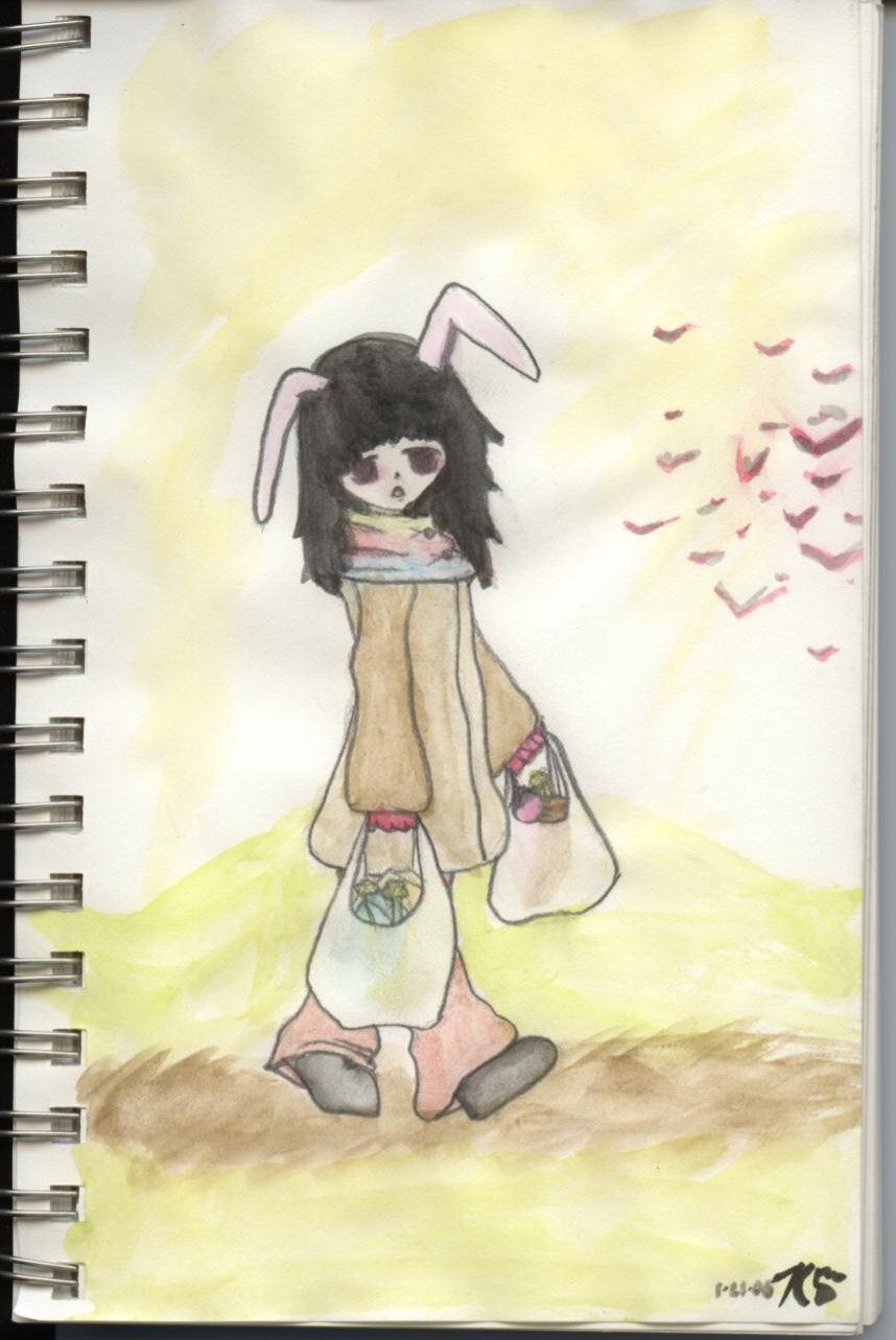 Um... A bunny girl coming home from shopping at the market. ^__^If you look closely you can see she bought celery potatoes, and some colorful boxed foods!! Oooh!! Wonder of wonders!!