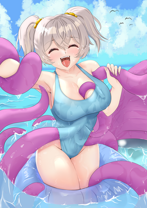 This is a beautiful slimy plant creature that is eating this beautiful bikini anime gal.