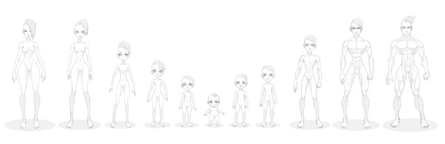 Aquí un estudio básico ha cerca del tema, en él he representado la figura humana masculina y femenina en diferentes etapas del crecimiento.
