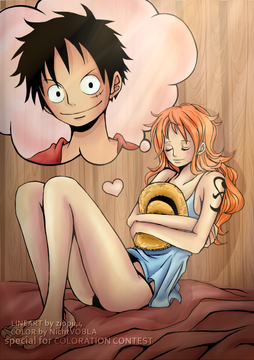 and you're right! the ocean and sky came out great! it feels like nami is picturing a scene, where luffy stood right in front of her like that! very realistic! and i like how the little heart matches with the blanket!:3