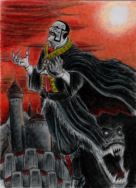 “What devil or witch was ever so great as Attila whose blood flows in these veins? Know that while history has called me by many names, one has echoed throughout the ages in infamy. Dracula. Son of the dragon. Son of the devil. During my old life I was a warrior, a ruler, and a sorcerer. My life’s dream was to see my nation of Wachallia independent, no longer a meer pawn of the Hungarians and Turks. To see that dream fulfilled, I first had to purge it from a great evil which plagued it. The Scholomance. A cavernous fortress in which the commoners believed the devil himself taught magic to his disciples. A folktale not far from the truth. It was here that the first vampire, which we then called strigoi, resided. Strahd Von Zarovich. The oldest and most powerful of his kind. His fellow strigoi spawn adherent to his every command. Ten of which he would choose as students to learn from him the darkest of magical arts. The greatest of these ten would be given command of his dragon to rage storms and other such havoc while the rest scoured the land to find targets worthy of their wrath. All this while they sustained themselves eternally with the blood of the living people. My people. With the aid of my companion Gabriel Anatolie, my most trusted seeker of magic knowledge, I lead my armies to wipe this blight from the face of Wachallia. It took much struggle and many lives. But in the end Strahd perished at the end of my own blade. In his dying moments he told me of a prophecy that the man who slayed Strahd would inherit all of his powers, if he partook of Strahd’s own blood. And if he partake in the blood of the living also, the curse would become permanent. Against my once friend Gabriel’s wishes, I secretly kept two small vials of his blood. I would need it. For when the Turks invaded my country the power I attained from drinking it increased my strength and magic to levels beyond my imagining. With this I drove the Turks from my land and brought salvation to my people. How was I repaid for bringing peace and order to my people? They betrayed me. Stripped of my powers and my throne, I was left to rot in a Hungarian prison. Unbeknownst to them, I kept the second vile hidden. With it I regained all my powers and this time bound them to me forever with the blood of the living. Now I rule all of the night, and one day the whole world shall kneel before the name of Dracula. As I impose true order upon the weak and feeble world of men. I shall have vengeance upon my former Seeker who has hounded me throughout the centuries. He and all who oppose me shall learn once again, why they fear the night.”