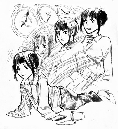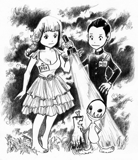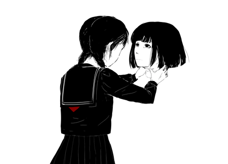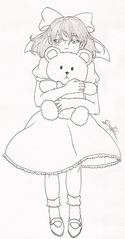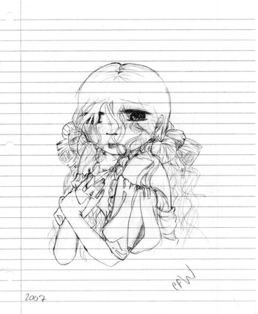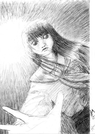 This is a drawing I did, attempting a more-realistic manga style.It depicts a girl whose dead brother happens to live in her hair. She usually wears ribbons to bind her hair into a ponytail, which traps her brother in the netherworld. However, if her hair is ever let down, he appears, and wreaks mischief in the world of the living.