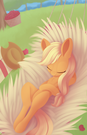 Cokolwiek by się nie stało z tymi egzaminami - warto było ^^ Dalszy rozwój stylu autora dał nam jeszcze dokładniej wykonaną Applejack, o poprawionych nieco proporcjach, staranniejszych cieniach i światłach (w pełnej rozdzielczości postać jakby lśni), a także znacznie ulepszonej ekspresji. Z pyszczka jest po prostu łagodna, spokojna. Co mnie cieszy, Applejack otrzymała bardziej puchate uszka i ogólnie wygląda to przeuroczo w połączeniu z jej wyrazem twarzy (szczególnie oczami i uśmiechem). Ponadto możemy podziwiać ładną, zatopioną w sianie grzywę, rysunek został wykonany w taki sposób aby kolory nie zlewały się ze sobą. Wyraźne kontury, staranne podkreślenie sylwetki postaci, efekty te zostały pogłębione dzięki zmianie ostrości obrazu - drzewo i jabłuszka widoczne na pierwszym planie są nieco rozmyte, podobnie zresztą jak widok w oddali (dużo bardziej komiksowe, ale wciąż pasujące co ogólnego tonu pracy, nic się ze sobą nie gryzie). W ogóle, powracając do siana i słomy, fizyka robi wrażenie - cienie padają w taki sposób by podkreślić poszczególne źdźbła, na przodach źdźbła przysłaniają ciało i grzywę, nadaje to wrażenia głębi. Grzywa i ogon również są nieco rozwiane. Znakomita praca: pełna kolorów, pogodnej atmosfery, miła dla oka Gratulacje!