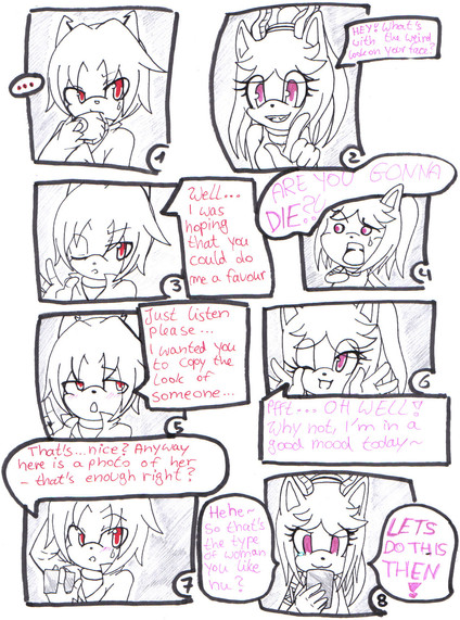 The girl then connected a body with a pink dress on it to the head. She then placed rose-like buds on the figure's head. She finally placed a red amulet on the chest. The girl then said, "Watch." A black fox with green eyes and white hair and tips on his tails walked towards her and said, "Yes Mistress Cmara." Cmara said, "The ball of life please." Watch said, "As you wish." He handed Cmara a little glowing ball and she popped it into the figure's mouth. She then wrapped her arms around the figure and gave it a big hug. She then set it against the wall and she and Watch looked at her for a few minutes.
