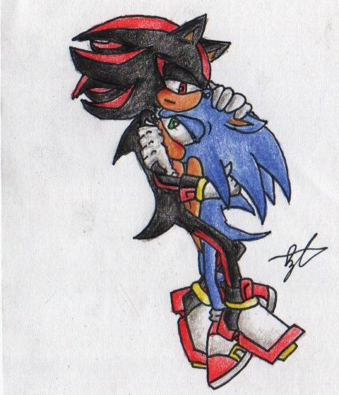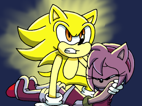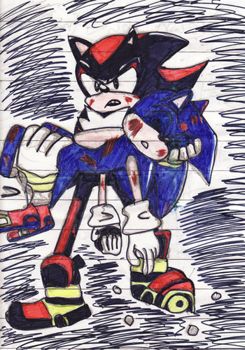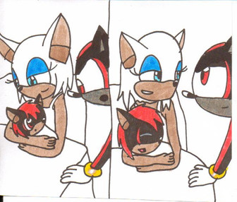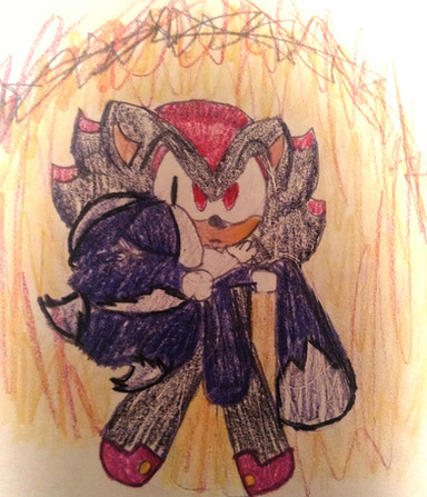 Saint the Hedgebat was having a fight with Eggman. He punched Eggman's robot and the robot punched back. Suddenly the robot grabbed him. He struggled and yelled, "Let go of me!" Eggman laughed and said, "Not a chance! Time for you to die!" The robot's chest opened up and a laser gun appeared. Saint gasped and closed his eyes. Suddenly, a yellow light crashed into the robot and the hand let go of Saint. Saint starts to fall but something catches him. He looked up and saw Shadow's face. He looked all around and saw that Shadow is in his super form. He said, "Dad...?" Shadow said, "Don't worry son. I gotcha." He put him down, turned around and said, "Time to end this Eggman! You'll pay for messing with my son!" He flew towards the robot. Saint smiled with a tear in his eye.