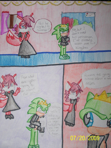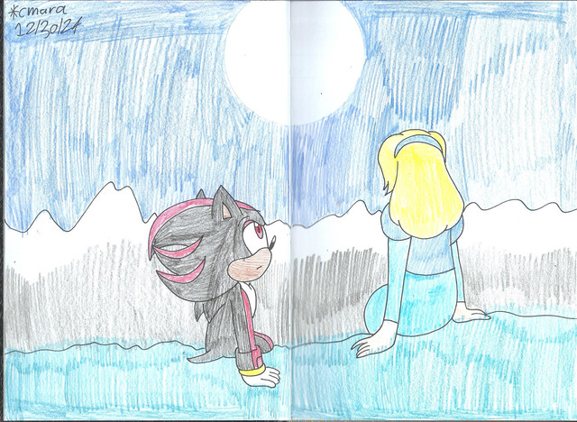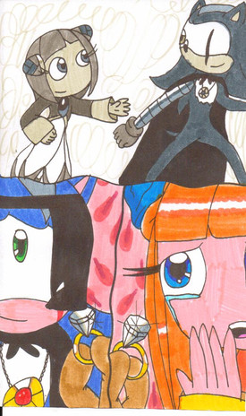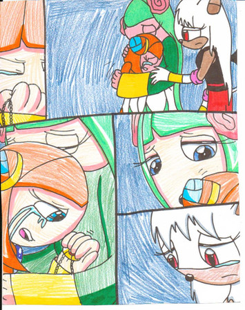 One day, Topaz was walking through the fields when she saw Muffy and Sharp looking at the sky. She smiled and walked towards Muffy. She said, "Hey Muffy." Muffy turned around and said, "Oh, hi Topaz." Topaz said, "How are things going between you and Sharp?" Muffy said, "Just fine." Topaz chuckled and said, "Come on, you two can do better than that." Muffy said, "What do you mean?" Topaz placed an arm around Muffy and said, "Just picture this:you and Sharp standing face to face with each other." An image of a very handsome looking Sharp and a beautiful looking Muffy appeared in Topaz's head. Topaz said, "You two take each other's hands and gaze into each other's eyes. Then, you will pour your heart out to him." Fantasy Muffy said, "Oh Sharp-kun, you look so rich and handsome in life. My heart beats every time I think of you. Without you, I would die and perish because you are a part in my past, present and future. You are the shining jewel in my eyes and the light in my heart. We're like intertwined souls, always together until the day they die. We'll always love one another and we'll never part ever again. I love you, Sharp the Hedgehog." Topaz giggled. Muffy said, "Forget it, Topaz, it's not gonna work this way." Sharp said, "What are you girls talking about?" Topaz said, "Oh, nothing. Nothing at all." She giggled again. Muffy sighed heavily.