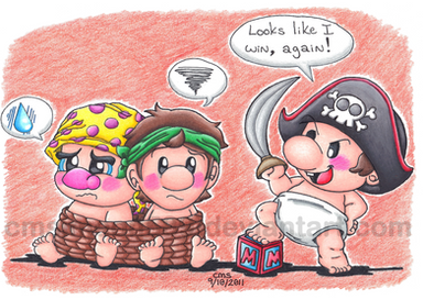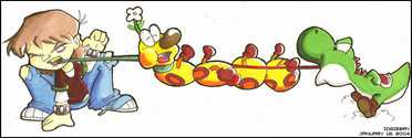 Anyways, getting to the point. Don't assume I hate Yoshi because I drew him getting his tounge pulled by Baby Wario. I just thought it would be funny....being as though he's always poking his tounge out....and well.....Wario wasn't always nice, even as a baby.