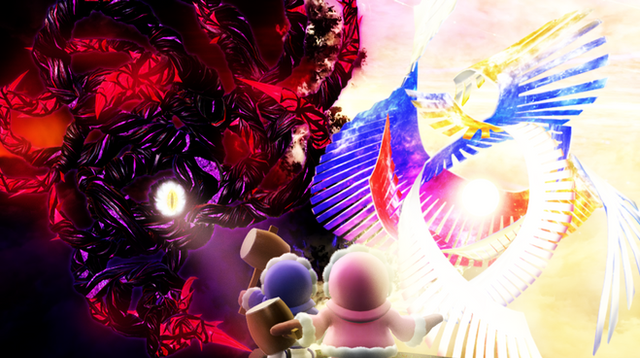 The last two battles loom over Kirby as the true final fight lies just behind them.I love Planet Robobot's true arena so much. I love that they brought back Dark Matter and Sectonia as bosses, even if they are just clones. Then Galacta Knight is there as well, which is pretty much expected, but dang is it a fun fight. The music for all of them is amazing as well. I love how Dark Matter's is a remix of both phases of his fight from Dream Land 2 while Sectonia's is a more robotic sounding version of her theme. Galacta Knight's theme is kinda the same as Sectonia's, getting more robot-y sounding, but it's just so good. The fights themselves are fun as well. I love how Dark Matter goes slashing about with his sword, and Sectonia is pretty much just a slightly watered down version of her fight in Triple Deluxe, which is a fun fight as well. As for Galacta Knight, I love how he just tears open a hole in reality occasionally. Don't need to say much else about that, I think.