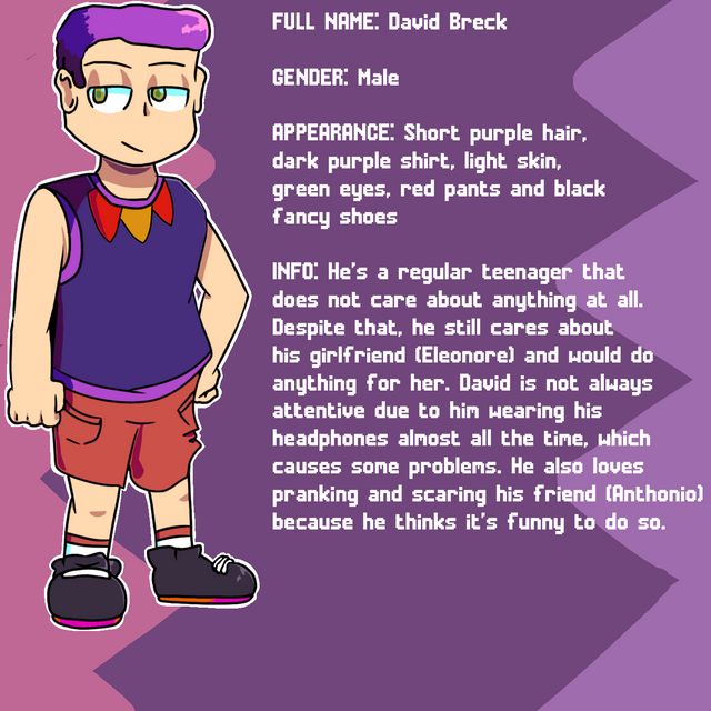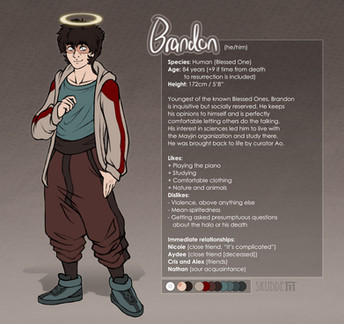 Brandon is easy going, living mostly care free. He cares deeply about his friends, and has a kind heart. He has issues opening up and isn’t the most approachable person in the world. He can be somewhat picky, but usually just goes with the flow. He can get quite worried easily, especially when a situation concerns a friend. Brandon has self image/worth issues, not always seeing himself in the best light. He always goes out wearing his signature jacket without almost any exceptions.