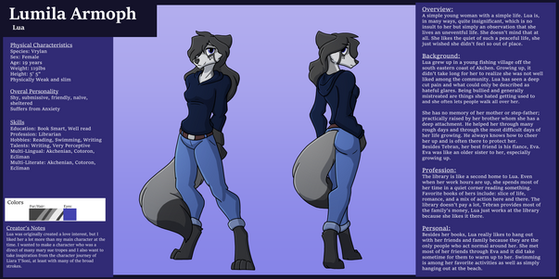 Lyn has a, to put it bluntly, “well rounded” physique. Her fur covers all finer details, so nothing stands out. In her human form, Lyn keeps the same physique and proportions with the only real change being her head since she loses her more animalistic features. She does, however, have freckles speckling both cheeks.