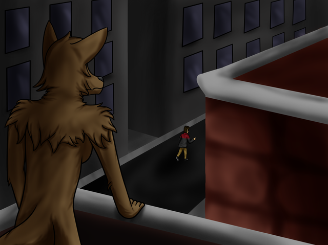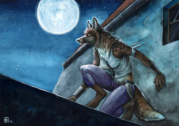 Nothing like some self doubt to spur on some inspiration for a drawing. Here we have Crys as a werewolf gazing over the ledge of a rooftop during one of those pesky full moons.Tried a few different things with this drawing. Firstly, the idea for the pose and such just kinda popped into my head. I messed around a little bit with perspective, since the metaphorical camera is situated at a low angle and to the side. It winds up making Crys' foot and leg kind of bigger since it's closer to the camera. I'd say I did a decent job for what I was going for, especially since I didn't use any pose references. Nothing seems too out of whack, and it all looks fairly proportional to me. I spent a bit of time working on the arms to make sure joints look right, especially with her left (viewers right) arm being bent like it is. Also, I changed up the shading that I usually do. Since I wanted this to be darker, I put aside my usual 3-layer method and did a sort of reverse shading. Basically I started with a really dark color then airbrushed the lighter highlights on top of that, then went back and added a few more dark highlights to make it look right. Think for a different approach to shading (and one I'm not very used to) I did pretty good.
