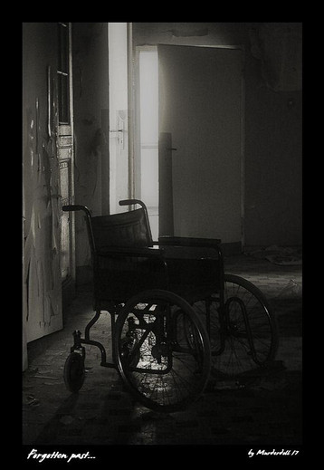 ...you know. I have worked in my share of institutions...it is amazing how much the hallway size changes with the period of abandonment. Notice how my chair easily consumes 50% of the hallway. My height is under 5'...I would not consider myself to be sooo large. I mean...back in the day, I could imagine only one large person to be wheeled down these hallways at a time. Nevermind probable med carts. Goodness! Not to mention the larger physical proportions of psych. patients (mostly due to medications and poor health education.) But just imagine...wheeling yourself down such narrow hallways, avoiding other patients who could -at any time- hallucinate, be triggered into a panic attack, or obsessive thought process.
