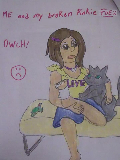 "Ow-ow-ow.. CAREFUL!" Raven winces and scowls."I'm trying to be! Just stay still!" I wrap the last strand of medical tape around her swollen toes, "ok, done. Hw do they feel now?"