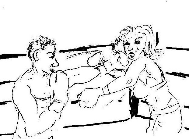 Mixed foxy boxing.A rookie male foxy boxer calls out a female heckler (an older woman) from among the club patrons. The heckler steps into the ring, strips down to her bra and panties and dukes it out with the rookie.