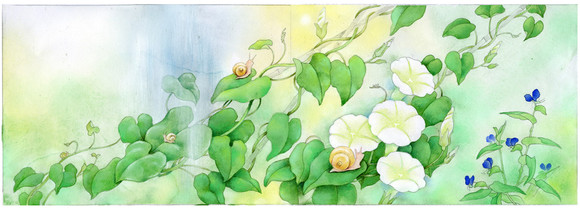 How cute! I like the little purple guy with feathery things for ears! (my computer wont load the fullview version sniffsniff). It's so light and happy, but then you have all that black space, I think that takes away from it, but that could kust be me.^^