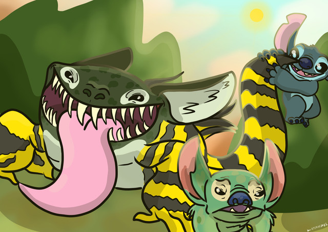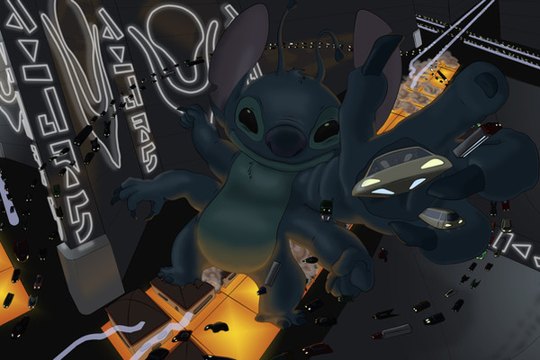 For Theme Park contest. This is a tribute to two rides that are technically the same ride. ExtraTERRORestrial Alien Encounters was an attraction in Tomorrow Land that ran from 1995 to 2003. The story of the ride is that an alien business group has created a teleportation tube to earth and, during a test of it, a giant, carnivorous alien monster is transported in and escapes into the audience. The ride was fairly popular, but was taken out due to it being to frightening for children. It was replaced by Stitch's Great Escape, especially the same ride but with Stitch and more kid friendly.Can't say I like the colors here, but the drawing overall is pretty good.