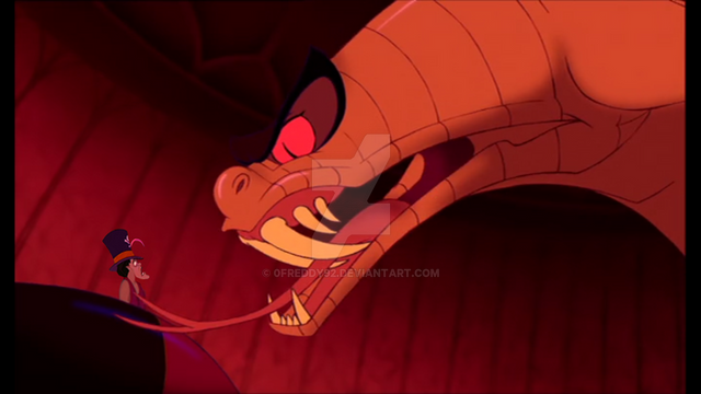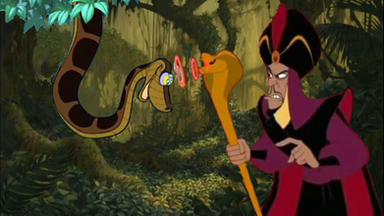 okay I can't tell who's winning but (takes Jafar's staff) I think this will be better off someplace else (my closet)