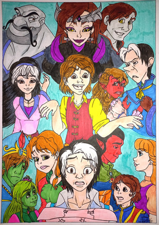 I was wondering why anyone else haven't chosen rumpelstiltskin, as its a well known story. Your adaptation is nice I love all your rumpel's character designs, especially the one in the front. You have did a good job