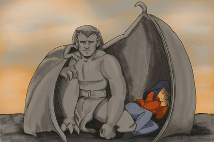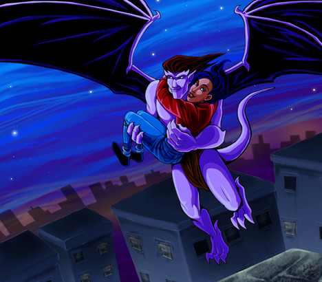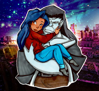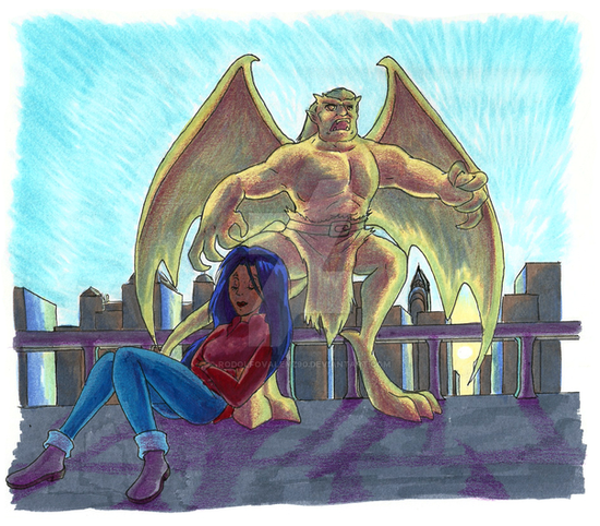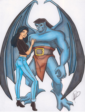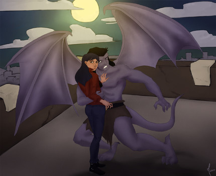 My second entry into Valentine's Day contest. Goliath and Elisa Maza from the TV show Gargoyles.My initial idea for the back story is that it is V-Day and Elisa wanted to have a romantic night with Goliath. However, just before sunset, she has to leave for some reason, slipping a simple cart into his frozen hand to explain the situation and tell him her feelings.