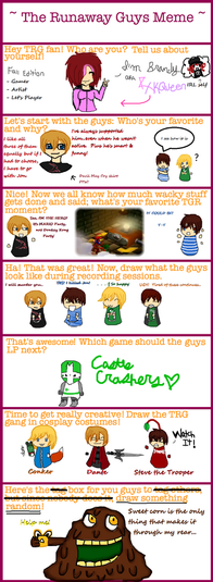 This awesome meme was done by the equally awesome ! Feww! This one took me FOREVER to do, mostly because I couldn't think of what I wanted to put for some of them. You can really tell which ones I work hard on from the ones I did when I was being lazy. But this was a really fun meme and its nice to see a ThatGuyWithTheGlasses one out there!1. its'a me!