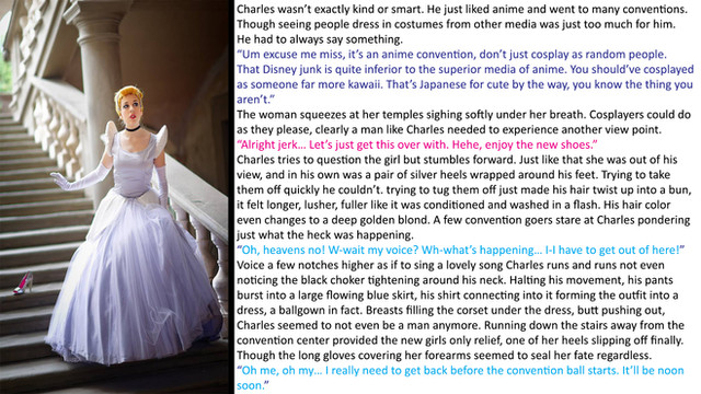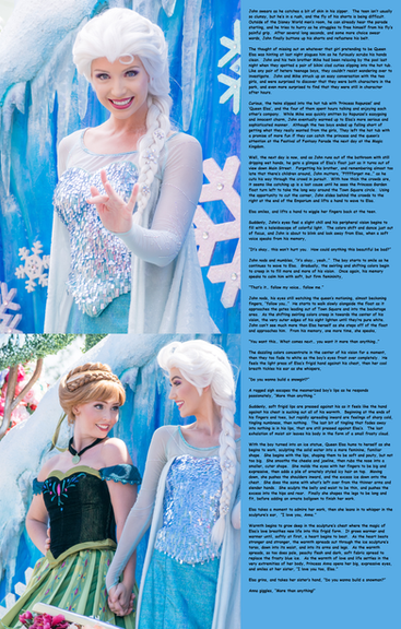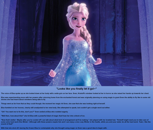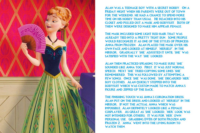 Besides changing physically, her behavior changed too. She had an optimistic but naive outlook on life. It could get her into trouble but it could also save her from it. Even her memories changed. Justin recalled her life as Anna. Memories she thought long forgotten about playing with her older sister Elsa flooded her mind. The only other thought Justin, or Anna, had was about the convention she would soon attend.