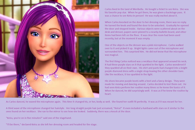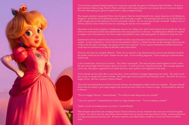 Once the hair was transformed, the changes spread to all parts that had yet to change. His face, arms, hands, and even genitals changed so he, or she, looked completely like Anna. With understanding, Justin took one of the ribbons and placed it in his hair as if he had been doing it all his life. He recalled how Anna left one of her ribbons behind in the movie, most likely to pay for the clothing she had taken.