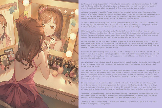The mask included some light red hair that was already tied into a pretty tight bun. Some people would recognize it as one of the styles of Princess Anna from Frozen. Alan placed the mask over his own face and looked at himself, "herself", in the mirror. Gradually "she" adjusted it until "she" was satisfied with the way "she" looked.