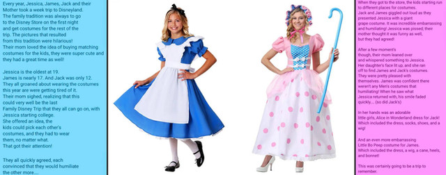 Charlie himself was transformed by the magic. His hair turned a light blond, lengthened, and placed itself neatly into a bun. Makeup appeared on his face, especially on the eyes and lips. His body became more feminine in appearance which enabled him to better fit the dress. As the final changes occurred he, or she, knew she was fully female.