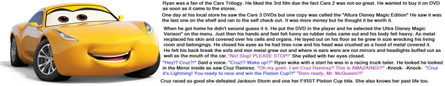 Ryan looked more or less like any other human being did. He was 25 years old with brown hair and brown eyes. His clothing consisted of a black shirt, green jacket, blue jeans, white socks with orange stripes, and yellow and white tennis shoes. It was a vast collection of colors in one outfit. The back shirt had a picture of Cruz Ramirez on it. Ryan did not think much of it at the time but that was about to change.