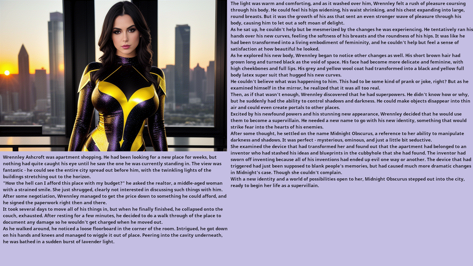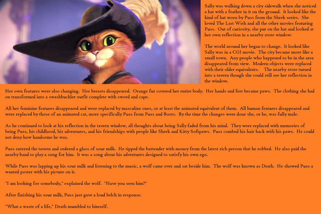 His arms and legs became round and black with his body changed to a bright yellow. His mouth moved outward while his eyes moved back and formed a windshield. Somehow he, or she, had become female. She was not entirely sure how she knew this since cars should not have gender.