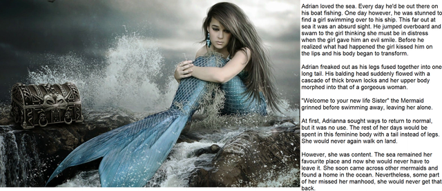 Looking around, Crimson could see the rest of the crew were becoming female too. They were about half a minute behind her. Over half the crew were driven mad. They jumped into the water as if that would change them back but all it did was make them wet and even more embarrassed than they were before. Some of them even drowned by swimming too deep into the ocean.