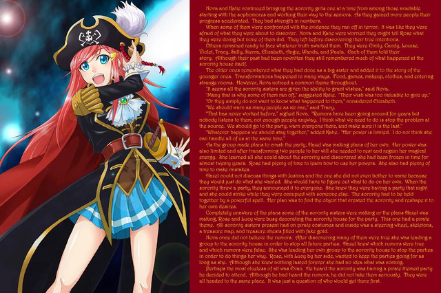As captain, Crimson was first to feel the effects of the curse. His bright red hair grew well past his shoulders, his fingernails grew long and silver so that they kind of resembled claws, and his outfit reshaped itself into a pirate dress showing both his shapely legs and the area below his neck. Breasts grew on him and the rest of him changed as well leaving him, or her, fully female.