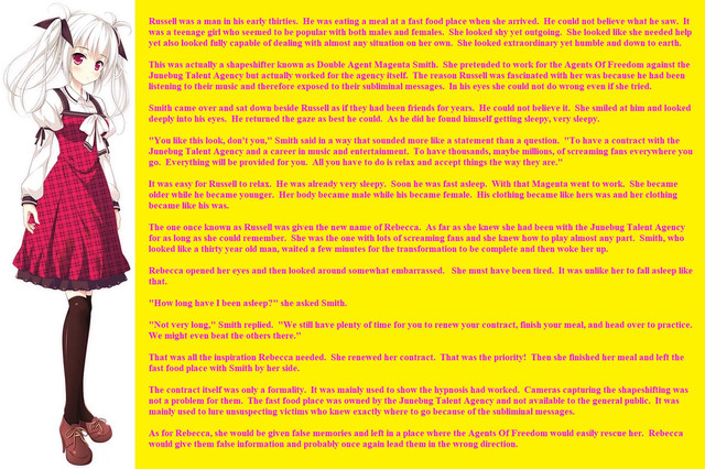 Eric attended the party at the sorority. He appeared not to care about anything, but the girls at the sorority knew that was not true. When Eric transformed into Erin, she still did not act like anything was out of the ordinary. This was not because she had forgotten her past but because, even before the transformation, she had become indifferent to it.