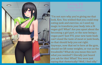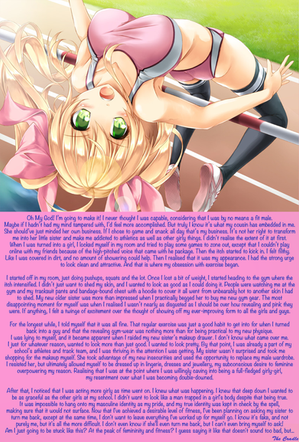 All his body hair disappeared and his clothing changed into a black tank top, red shorts, and green tennis shoes which matched the woman in the video. His exercise pace increased, Soon he was able to keep up with the woman in the video who he looked like. All remaining masculine features gradually changed into feminine ones, including his genitals. By the time the video was done he, or she, had become fully female and looked just like the woman in the video.