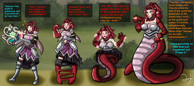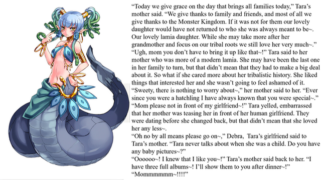 Next the changes began. His bottom half changed into a snake while his top half changed into a woman. Surprisingly, neither of those changes got his attention. What did get his attention was how his pants changed into a dress so his, or her, snake tail could fit underneath. She wondered how her clothing had changed along with everything else. Then she remembered it was an enchanted forest.