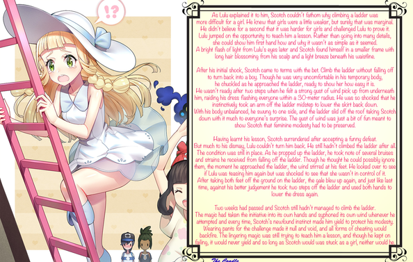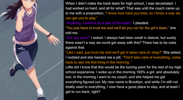 Catching a glimpse of himself in the gym mirror wall, Larry could see he was more curvy, his hair had gotten longer, and he had grown breasts. He did not have time to look at himself for long. His instructor asked him to do more and more difficult routines.