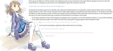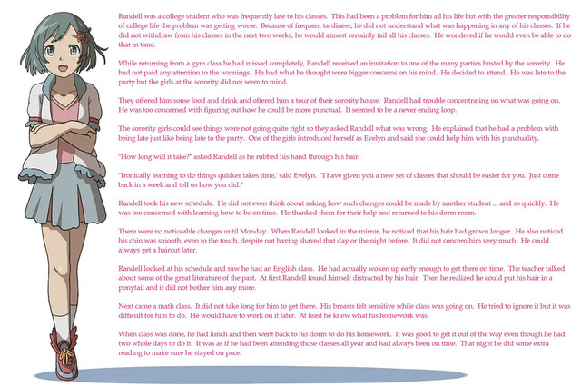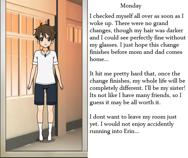Other changes happened too. His hair grew longer. His genitals changed making him a girl. The name Katie flooded through her mind causing the name Keith to disappear completely. Her clothing became slightly more feminine, though still gender neutral, and changed into school colors.